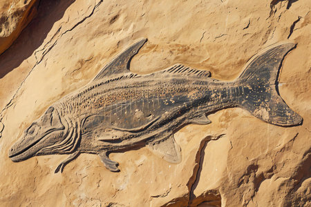 Fossilized fish on the rock in the museum of prehistoric petroglyphs