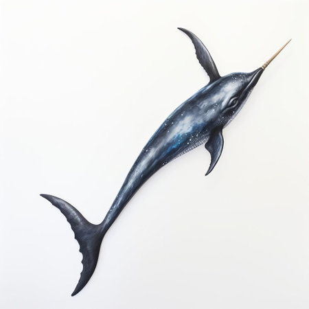 the majestic narwhal, often referred to as the unicorn of the sea, is beautifully captured in this stunning hyper-realistic watercolor painting, set against a crisp white background, showcasing its distinctive spiraling tusk and sleek gray body, with high contrast adding depth and dimension to this breathtaking marine mammal artwork. ai generated
