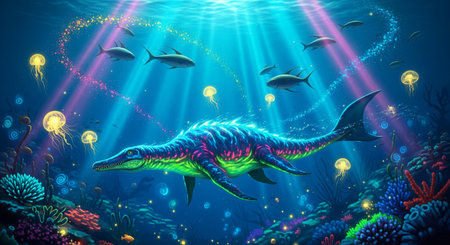 A plesiosaur swimming in a magical, bioluminescent underwater world with glowing fish and jellyfish