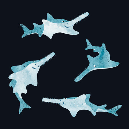 Set of cute cartoon sawfish. Vector sea fish watercolor illustration