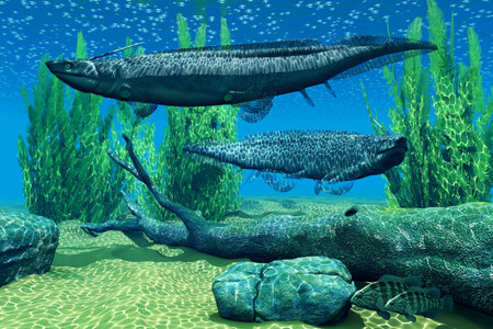 An illustration of a group of Dunkleosteus circling in search of prey in a warm Late Devonian Sea. Dunkleosteus is a genus of giant prehistoric fish existing about 380–360 million years ago. Dunkleosteus would have been one the most menacing marine life