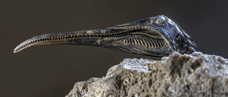 A close-up of a fossilized bird skull with a long, pointed beak rests on a rough, gray rock. The skull is dark gray and shows intricate detail of the bird's teeth and bone structure. The background is a soft, out-of-focus brown.
