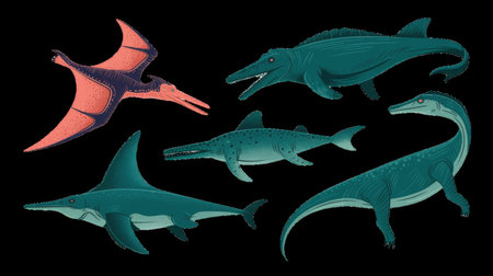 Set of prehistoric marine reptiles and pterosaurs flying and swimming