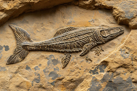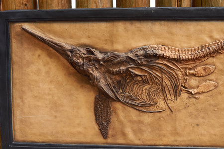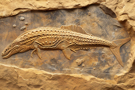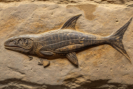 Fossilized fish on the rock in the museum of prehistoric petroglyphs