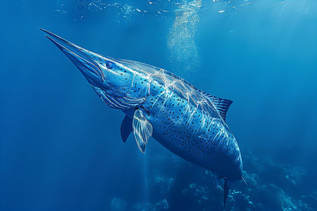 A lone swordfish slicing through the deep blue ocean, its sharp fin visible.