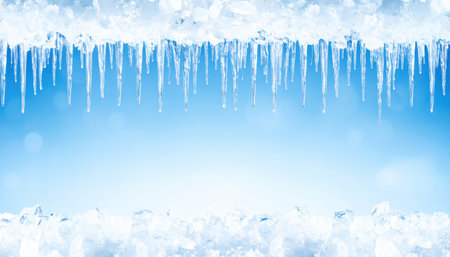 Dripping Icicles on Blue Background, Many Melting Icicles, Clean Water Falling Down from Icicles with Copy Space, Generative AI Illustration