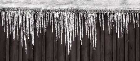 Closeup icicles background. Icicles hanging down from a roof. Cold winter weather, winter season concept