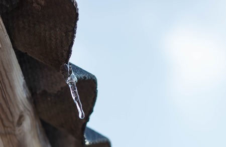 Dripping icicles. Melting Icicles, against the blue sky. close-up. Spring drops.