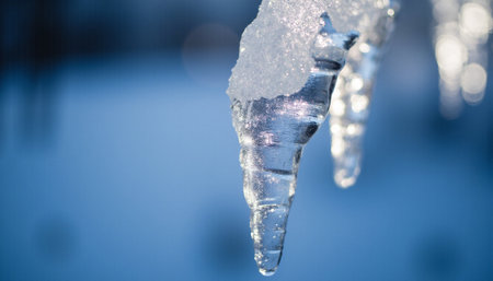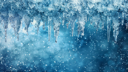 Stunning image of icicles hanging from a frost-touched surface against a sparkling blue backdrop, showcasing the beauty of winter's chill and frozen formations.