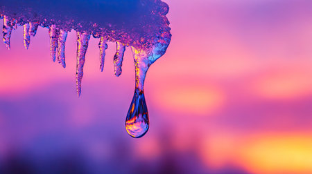 A single melting icicle, its droplet reflecting the stunning colors of the evening sky.