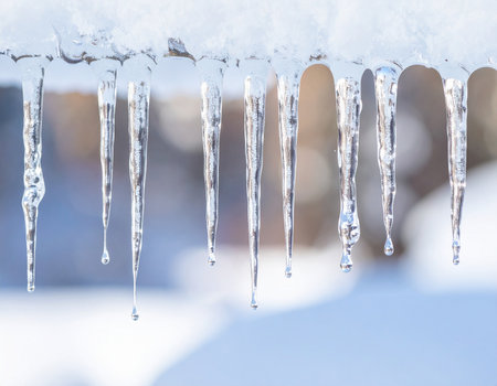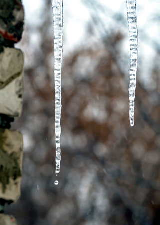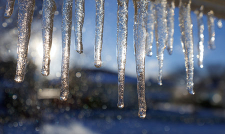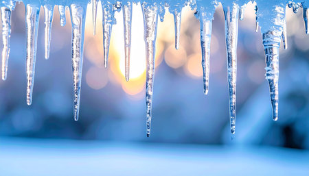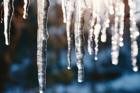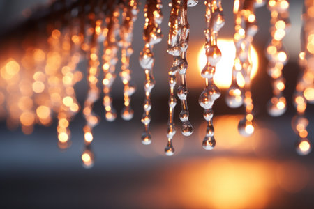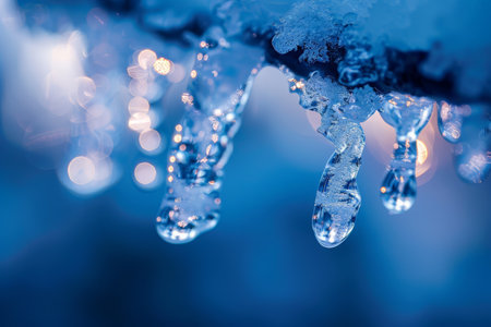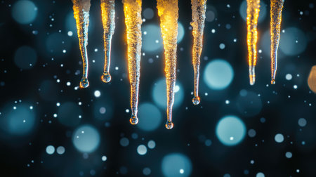 This captivating photo features glimmering icicles with water droplets, set against a dreamy bokeh background. Ideal for winter themes and nature-focused projects.