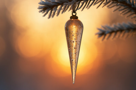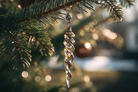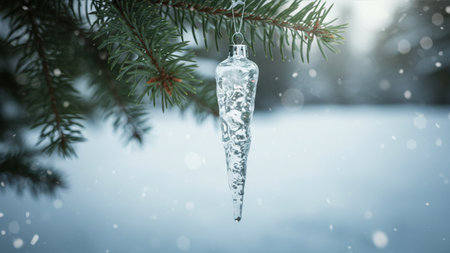 Sparkling crystal icicle ornament hangs gracefully from a Christmas tree branch, illuminated by soft bokeh lights, enhancing the festive ambiance with copy space