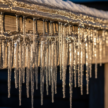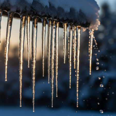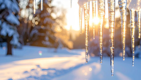 Icicles glisten in the early morning sun, hanging from a roof edge while a snowy landscape reflects the day