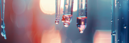 Dripping Liquid from Pipette into Test Tube in Laboratory, Light Airy Environment Test Tubes Closeup, Blurred White Background, White-Blue Colors, Copy Space, Generative AI Illustration