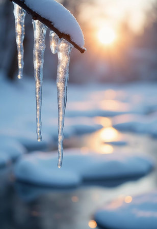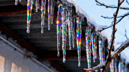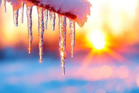 Warm sunlight filters through clear icicles casting vibrant prisms of color against a softly blurred snowy landscape. The scene captures the beauty of winter at sunset showing natures artistry.