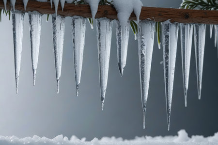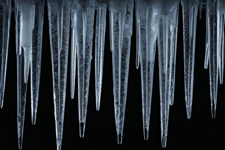 An extreme close-up macro photograph capturing dangerous, sharply pointed icicles formed naturally a