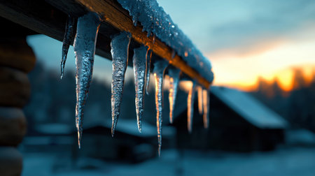 A mesmerizing winter wonderland unfolds as sparkling icicles hang from a roof bathed in the warm glow of sunset The scene is a breathtaking spectacle, perfect for capturing the magic of Christmas The glistening ice crystals catch the golden light, creating a mesmerizing display of nature's artistry AI Generative