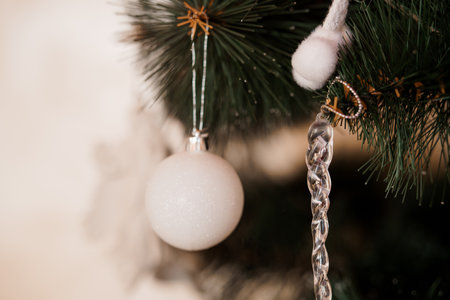 Transparent Christmas balls and icicles on the Christmas tree with a garland.