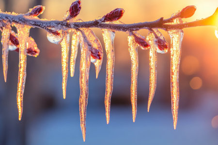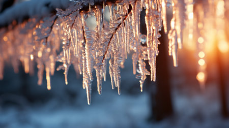Frozen icicles dangle from a tree branch, catching the sunlight and creating a beautiful glistening effect. The winter setting showcases natural beauty and intricate details.