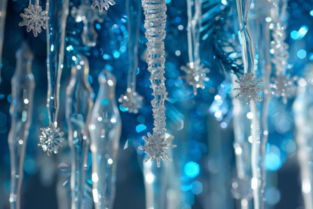 Icicles and snowflakes glisten against a blue backdrop, Glittering icicle ornaments in shades of blue and silver