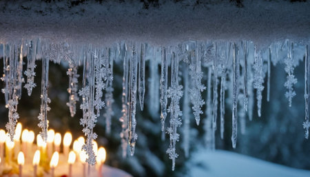 Intricate icicles adorned with snowflake shapes hang above glowing candles, creating a magical contrast in a snowy outdoor setting.