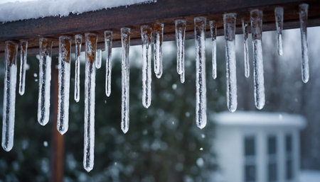 Sharp, transparent icicles hang in a row from a snow-dusted wooden railing, showcasing the beauty of winter's frost and cold.