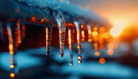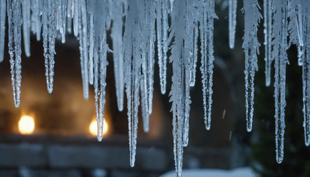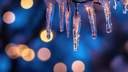 Detailed macro shot of icicles hanging, illuminated by soft bokeh lights in the background, highlighting the cold and crystalline texture.