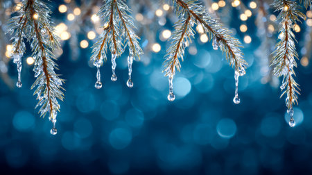 Graceful pine branches draped in shimmering ice, with slender icicles reflecting gentle light, set against a softly blurred icy blue glow and twinkling festive highlights