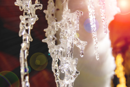 Icicles hang against golden bokeh background, close-up. The concept of winter and winter holidays.