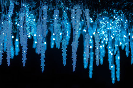 Glowing blue christmas lights shaped like icicles shine brightly against a dark background, creating a festive and magical atmosphere perfect for holiday celebrations