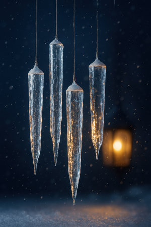 Long icy icicles hang on strings in falling snow. Warm lantern glows softly in the distance. Moody winter night scene.