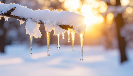 Icicles hang from a tree branch, reflecting the warm sunset light as snow covers the ground, creating a serene winter atmosphere.