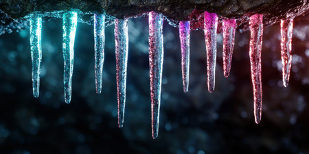Vivid ice stalactites captured in a row, a spectacle of frozen colors