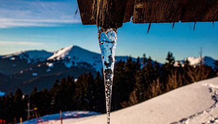 A breathtaking close-up of icicles hanging from a roof, illuminated by sunlight against a stunning snowy mountain backdrop. The scene captures the essence of winter's beauty and tranquility.