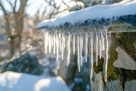 A mesmerizing winter wonderland unfolds as sparkling icicles hang from a roof bathed in the warm glow of sunset The scene is a breathtaking spectacle, perfect for capturing the magic of Christmas The glistening ice crystals catch the golden light, creating a mesmerizing display of nature's artistry AI Generative