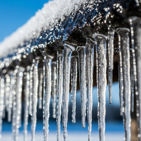 An extreme close-up macro photograph capturing dangerous, sharply pointed icicles formed naturally a