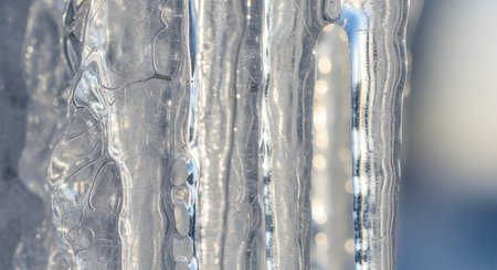 textured surface of an icicle, emphasizing its transparency and the intricate ice formations within. Generative AI