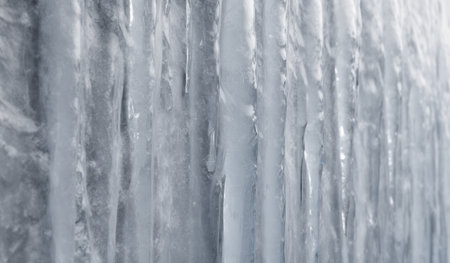 Discover a serene winter scene featuring frosty icicles hanging down against a light backdrop. This icy display captures the essence of cool winter beauty, ideal for seasonal themes or decorative purposes.