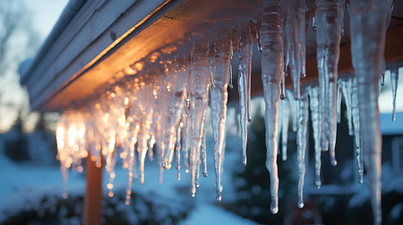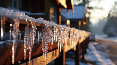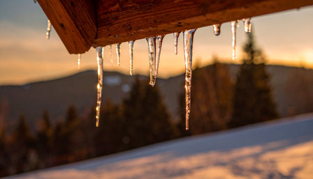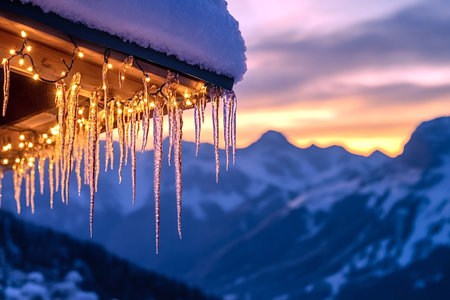 A captivating winter scene featuring shimmering icicles hanging from a roof. The majestic mountains and warm sunset create a tranquil atmosphere, making it perfect for nature lovers and winter enthusiasts.