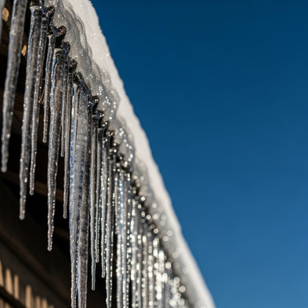 Long, clear icicles drip from the eaves of a rustic wooden building, covered in fresh white snow, under a clear, pale blue sky on a cold day.