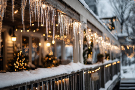 Glistening transparent icicles hang from a snow covered window frame. soft, warm bokeh lights blur in the background, creating a serene winter atmosphere.