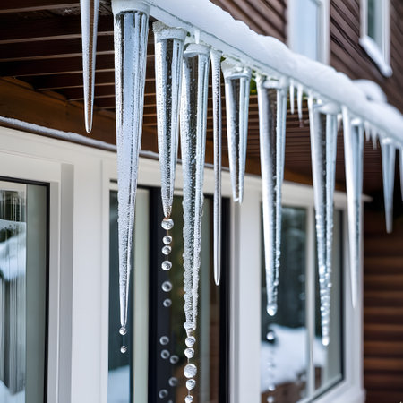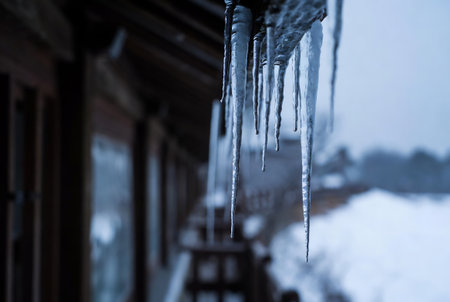 Long icicles form under a roof, reflecting the chilly atmosphere of a snow-covered mountain scene in the height of winter.