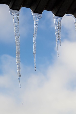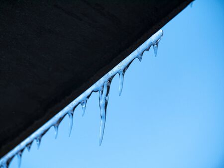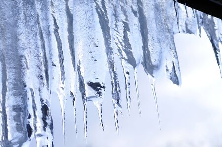 Closeup icicles background. Icicles hanging down from a roof. Cold winter weather, winter season concept