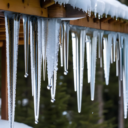 Close-up view of icicles forming under a wooden structure, showcasing their unique shapes against a serene snowy landscape.