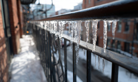 Sharp, transparent icicles hang in a row from a snow-dusted wooden railing, showcasing the beauty of winter's frost and cold.
