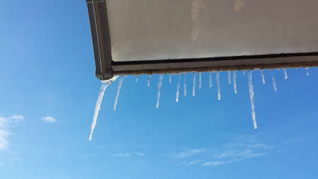 Icicles on background of blue sky. Concept. View from window of hanging clear icicles on clear day. Beautiful icicles over window on background of blue sky