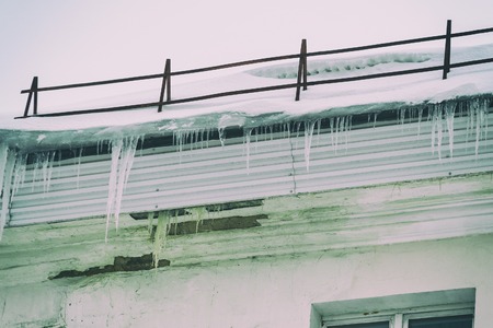 Russia. Terrible huge icicles formed on the roof peak and balconies of a multi-storey building due to a poor roof storm system.
