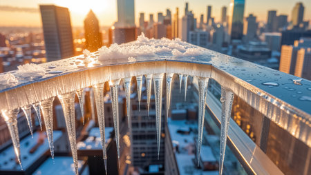 large icicles on the roof of a high-rise building in a metropolis, beautiful snowy sunny day