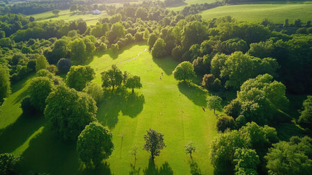 Aerial view of a serene green park featuring lush trees and vibrant grass. The sunlight casts beautiful patterns, creating a peaceful outdoor escape.