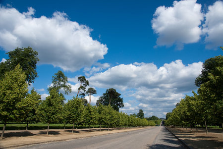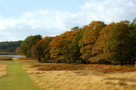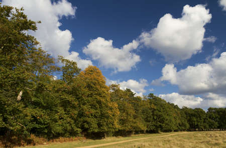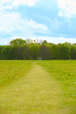 Landscape with trees, path and field in sunny summer day in Richmond Park, London, UK.